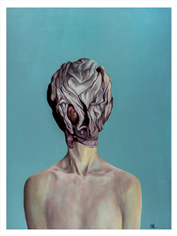 La figura es un busto aparentemente humano, pero con la cabeza modificada con una especie de máscara de piel dañada que oculta su rostro. Se encuentra aislada, sobre un fondo sobrio, sin nada más a su alrededor, con la única ayuda de sí misma para enfrentarse a tal dolor.