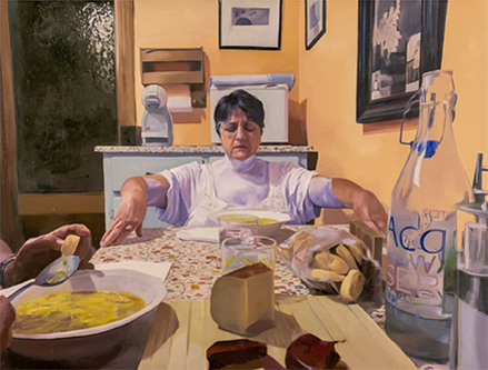 Ponerse en la piel del otro no es fácil, de ahí que reflejar la Dermatitis Atópica grave sin padecerla sea un reto. Como artista tan solo puedo observar y reflejar la realidad de la vida cotidiana de quien la padece. Esta es Ana Cruz cenando.